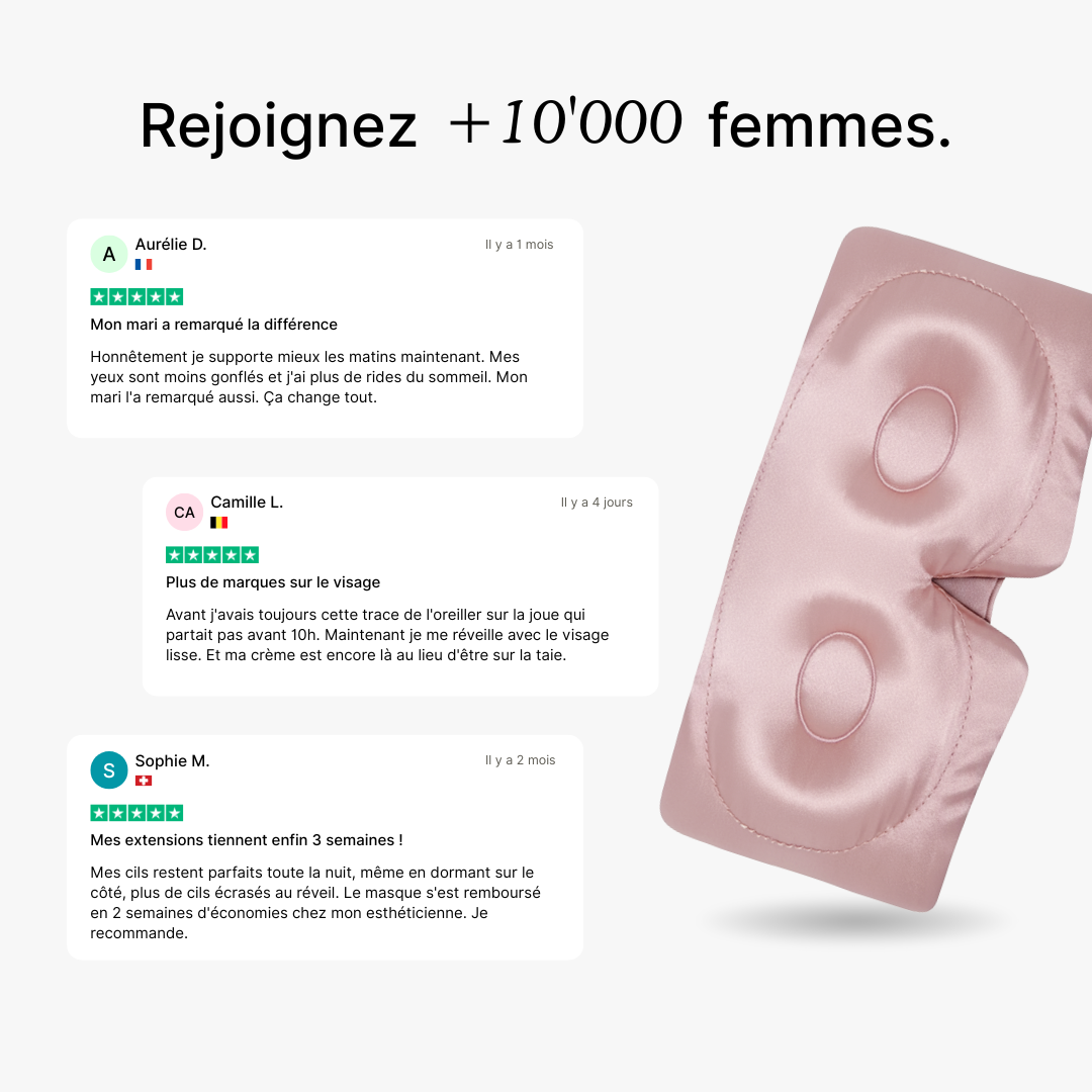 Rejoignez plus de 10 000 clientes qui ont transformé leur sommeil avec le Masque de Nuit ELEN LORÉ. Conçu en pure soie de mûrier 23 momme, il allie confort enveloppant et protection Cloud-Contour™ 3D pour préserver vos cils et votre peau. Hypoallergénique, thermorégulant et bloquant 100% de la lumière, il garantit un sommeil profond et ininterrompu. Recommandé par les dermatologues, il vous aide à :